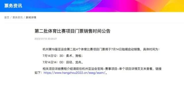 刚刚,杭州亚运会票务官网发布最新音书:杭州第19届亚运会第二批4个体育比赛项目门票将于7月14日不竭启动销售,具体时刻是什么时刻?一齐来看!还有这份对于公众售票的常见问题解答,速速保藏!