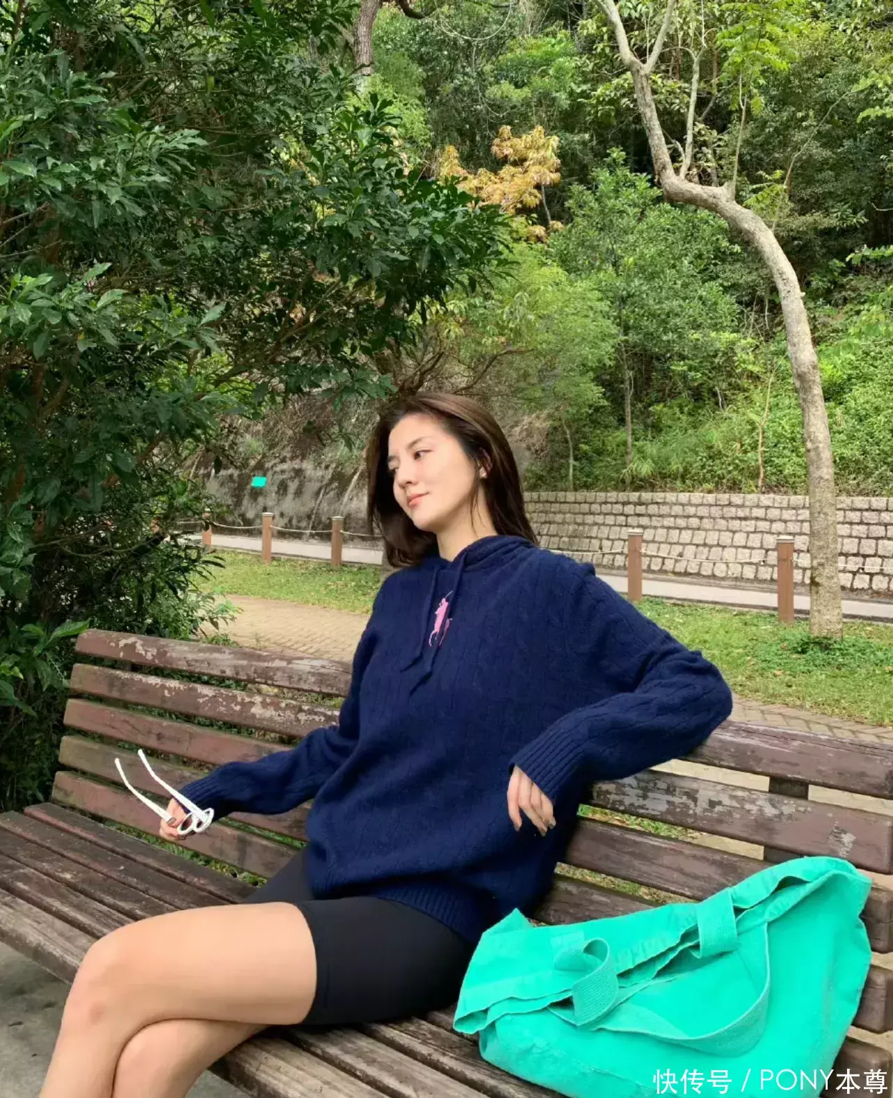 她的穿搭中带了老钱感!比如上头的蓝色连帽衫,搭配玄色瑜伽短裤,搭绿色帆布包,简通俗单的老钱感!
