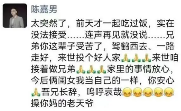 6年工夫里,他经心养痾,以致在两年前达到康复的水平,连大夫都以为颤抖。       没思到,如今会须臾病情恶化,还来不足救治就离开了,确切让东谈主未必。       目前,家属还千里浸在悲伤中,久久难以罗致。 其实之是以会患上胃癌,和向云鹏永恒在剧组吃盒饭,其后转行作念商业,每天至少喝两瓶白酒干系。       不良的饮食风尚,长久不断,这才导致如今的悲催       !       咱们在诅咒他的同期,其实也给生者以警示:珍视人命看重躯壳。       38岁陈晨       要是说年岁大躯壳差循规蹈矩,那童星陈晨的离开,就确切让东谈主弗成涌现。